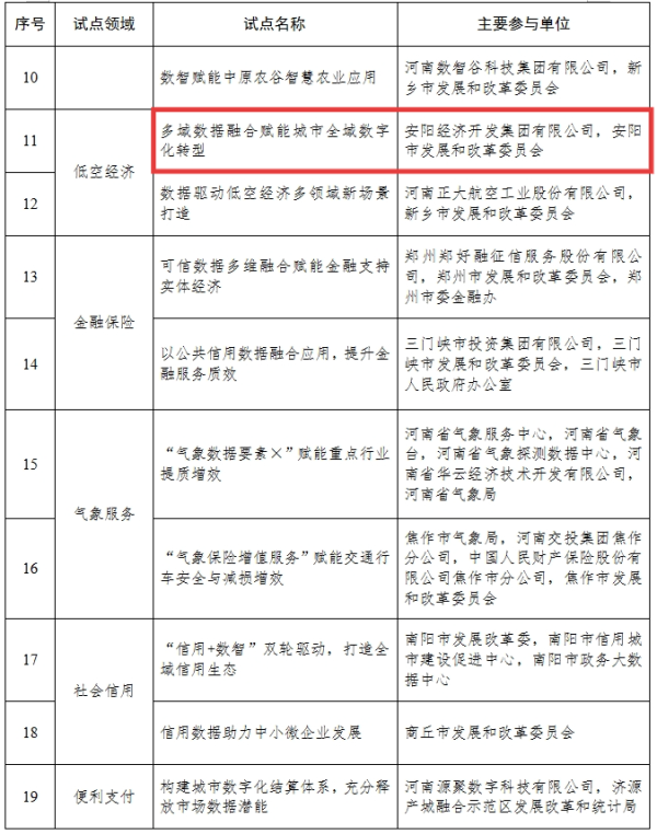 近日,河南省發(fā)展和改革委員會發(fā)布《關(guān)于印發(fā)首批河南省重點領(lǐng)域數(shù)據(jù)資源開發(fā)利用試點名單的通知》,集團(tuán)下屬經(jīng)開信息化公司申報的“多域數(shù)據(jù)融合賦能城市全域數(shù)字化轉(zhuǎn)型”(低空經(jīng)濟(jì)領(lǐng)域)項目成功入選全省首批數(shù)據(jù)資源開發(fā)利用試點。