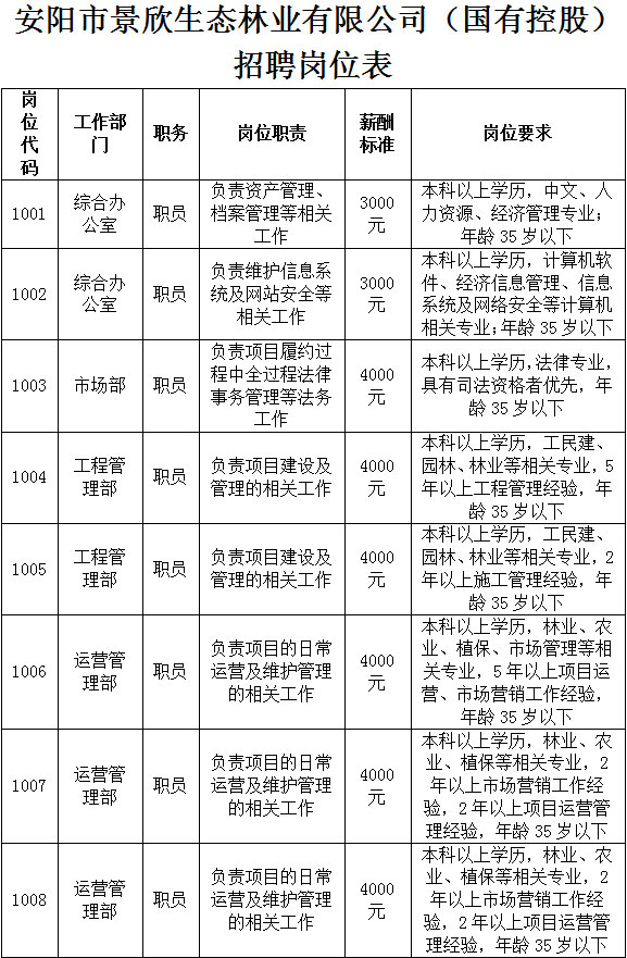 根據(jù)工作發(fā)展需要,現(xiàn)委托安陽鼎泰勞務(wù)派遣有限責任公司面向社會公開招聘8名員工,派遣至安陽市景欣生態(tài)林業(yè)有限公司工作?,F(xiàn)將有關(guān)事項公告如下: